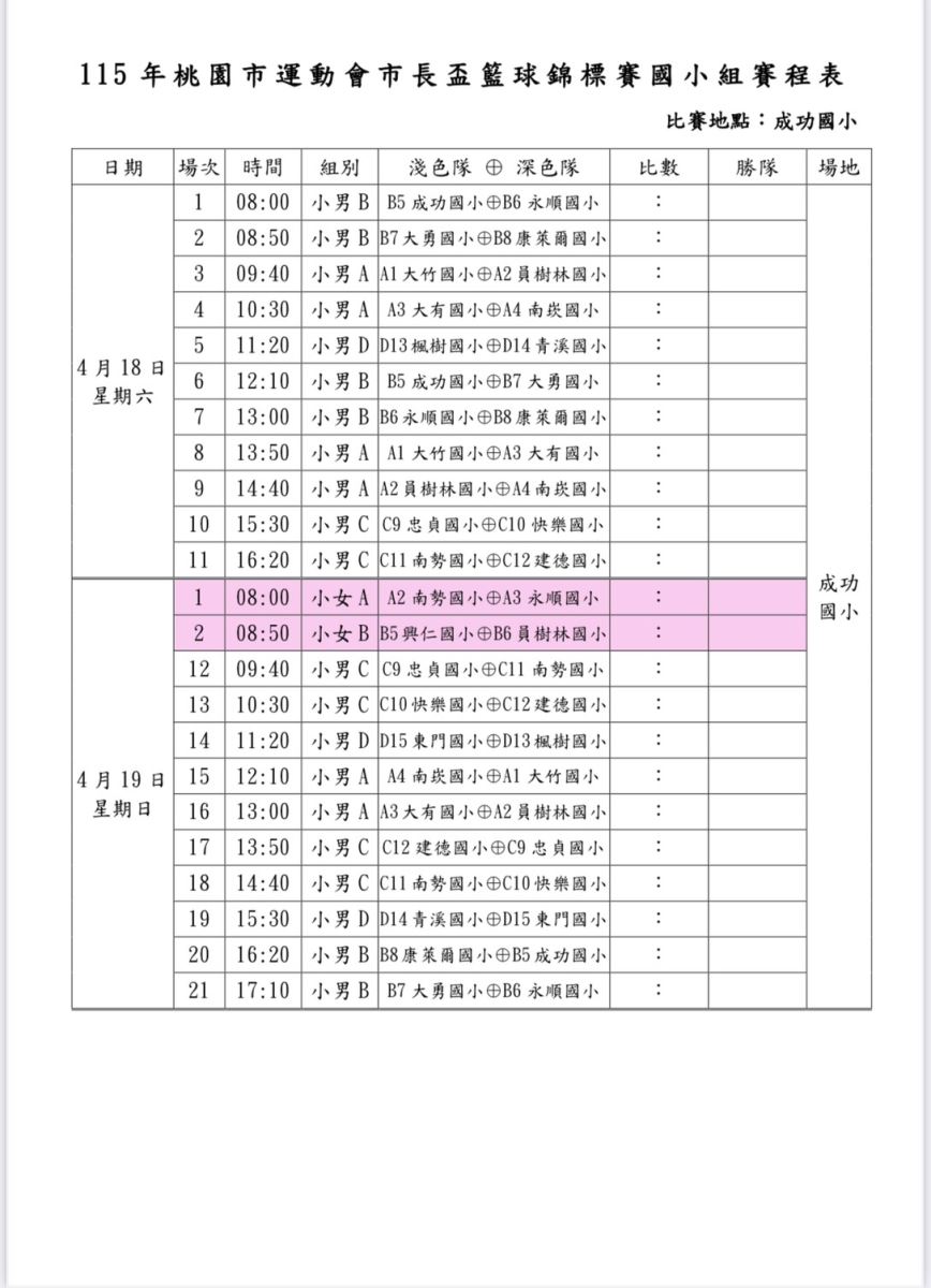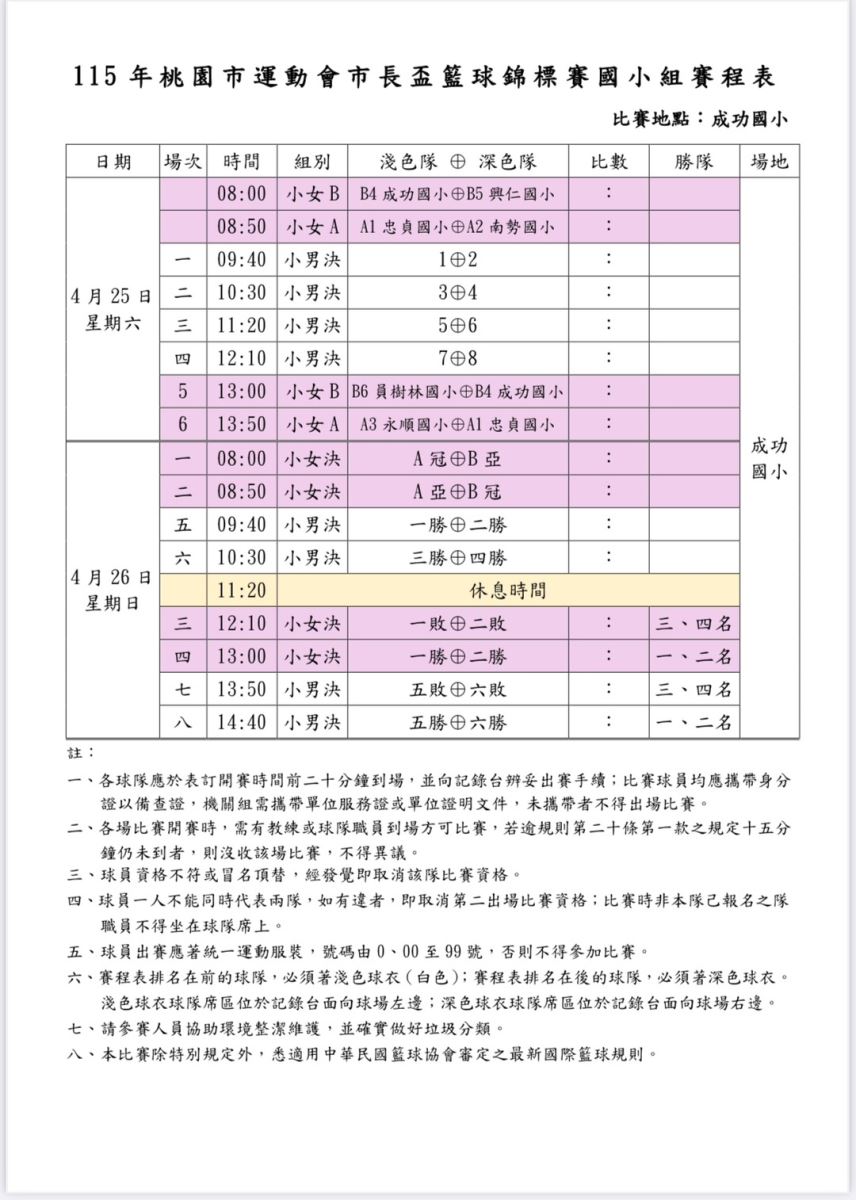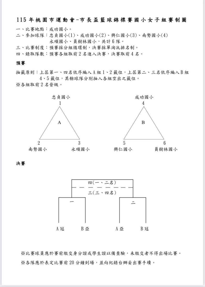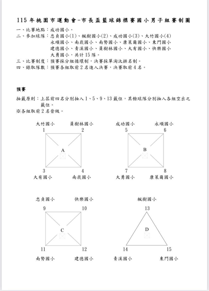 📣115年 市長盃 - 國小組賽制圖、賽程表